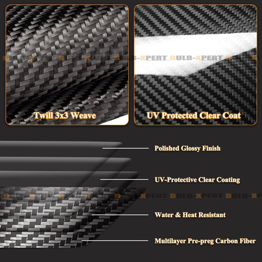 - Full Prepreg Dry Carbon Fiber Structure Coated With Glossy UV-Resistant Clear Coating. Please Note the Back Side is Not Coated. Only the Front is Clear Coated.