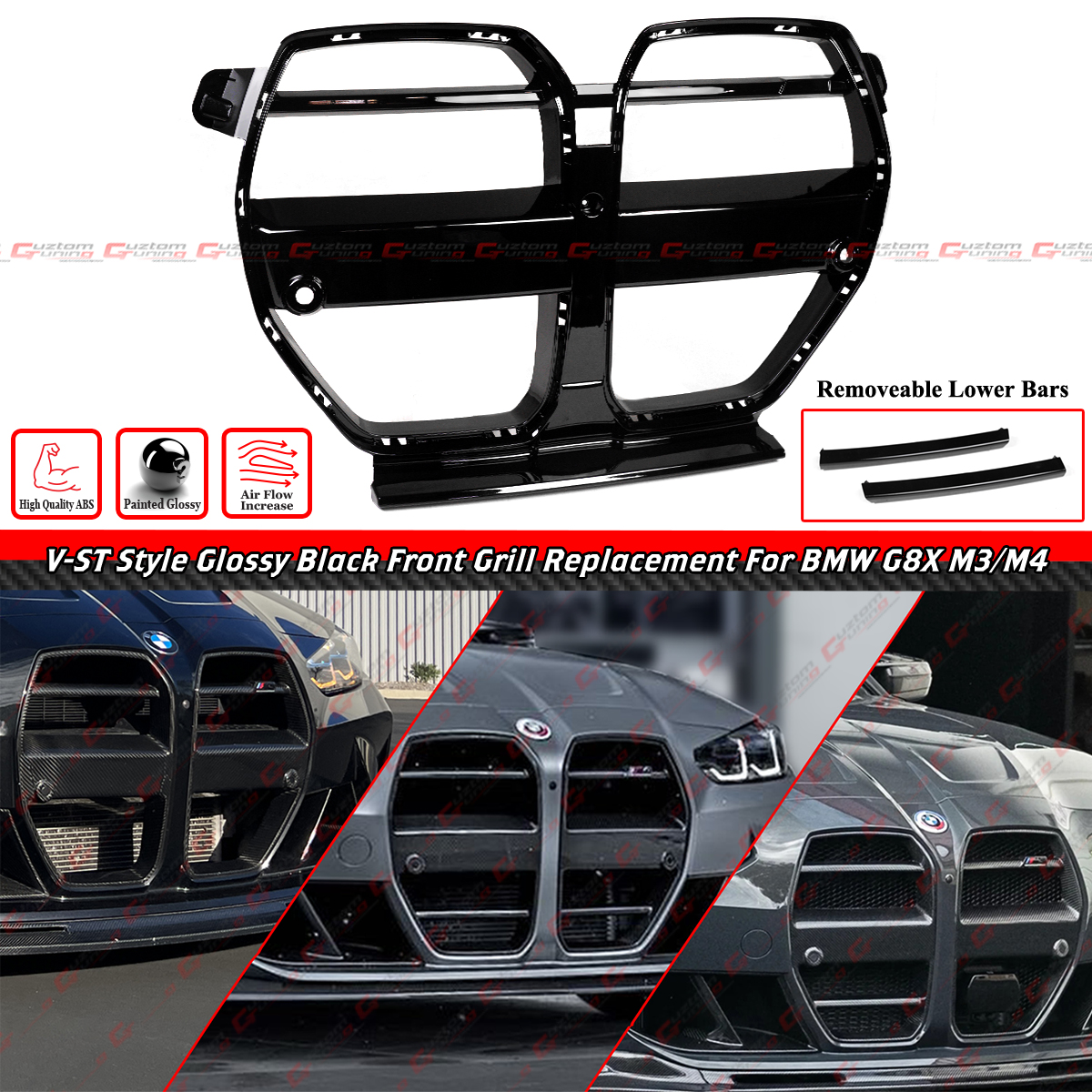 - V-ST Style Glossy Black Replacement Front Grill Replacement. Comes With Removable Optional Lower Bars To Fit All G80 M3 and G82/G83 M4 Models.
