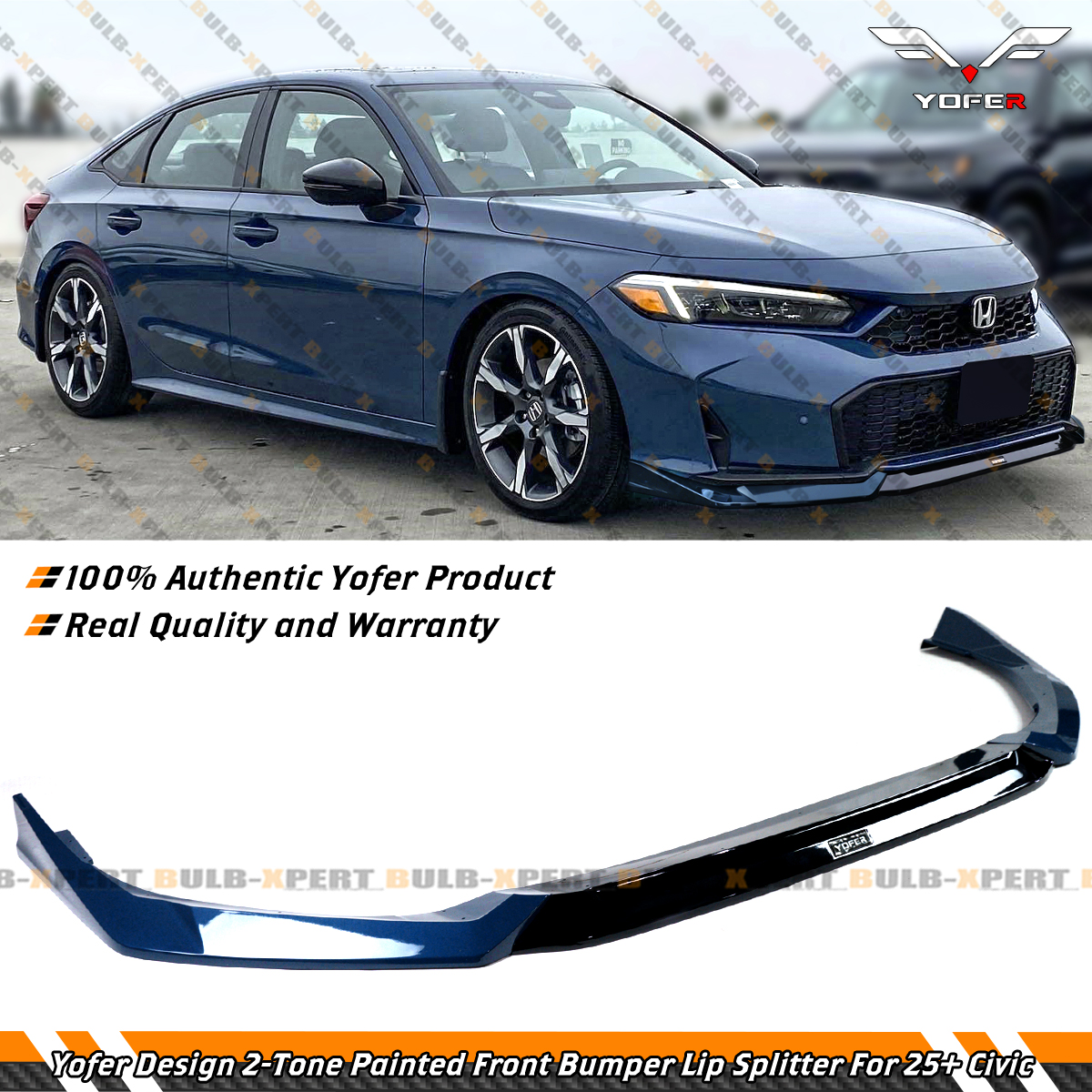 - Yofer Design 3 Pieces Special 2-Toned Painted Front Bumper Lip Splitter Kit For 2025 and Up Facelifted Civic (2 Pieces Side Splitters + 1 Piece Central Lip Splitter). The Kit Comes With Yofer Logo Decal and It Has An Indent In The Middle For You To Put The Decal.