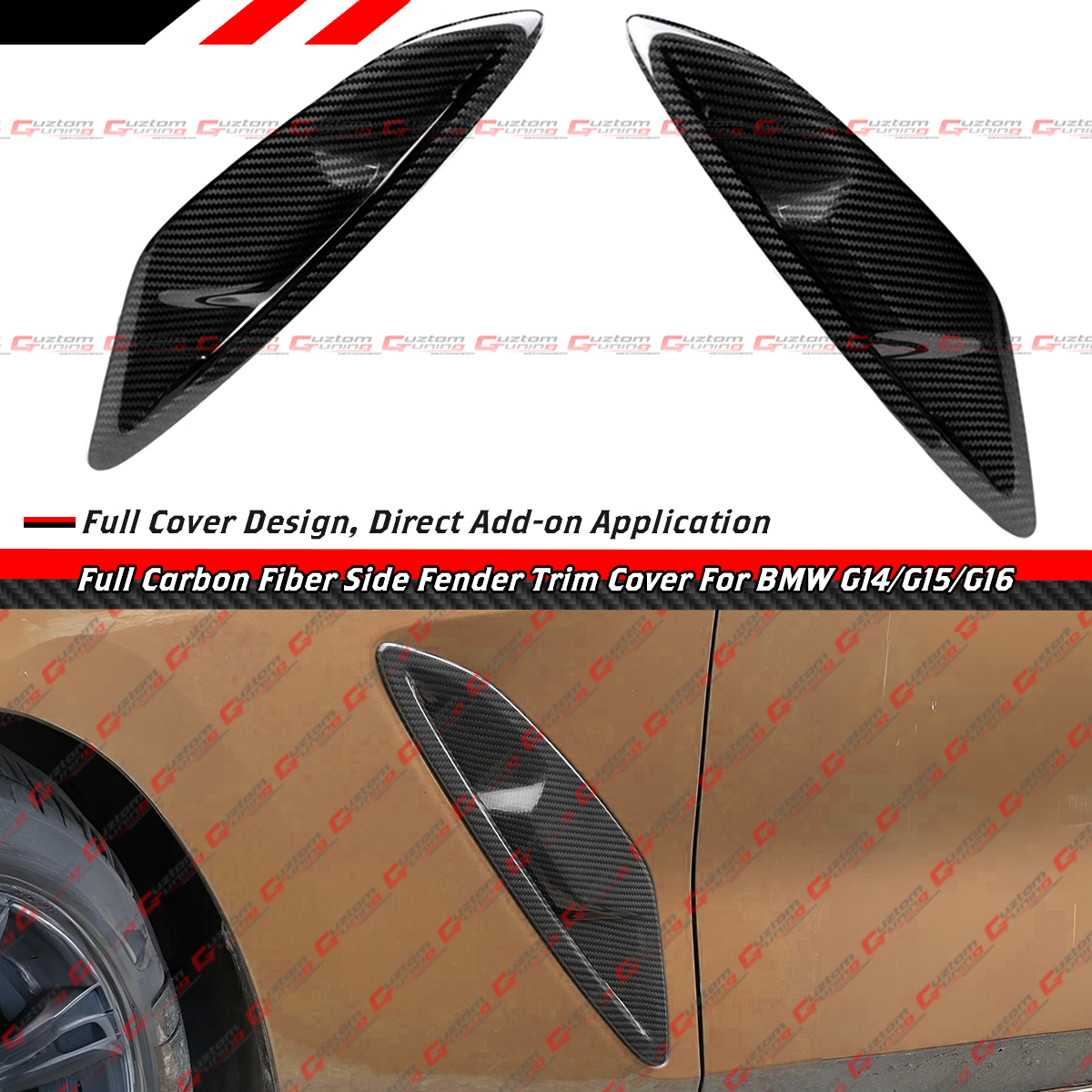 - Full Prepreg Carbon Fiber Front Fender Side Badge Garnish Trim Covers For 8 Series. This is The Full Size Cover Design, It Will Give You The Luxury Yet Sporty Look Right Away.