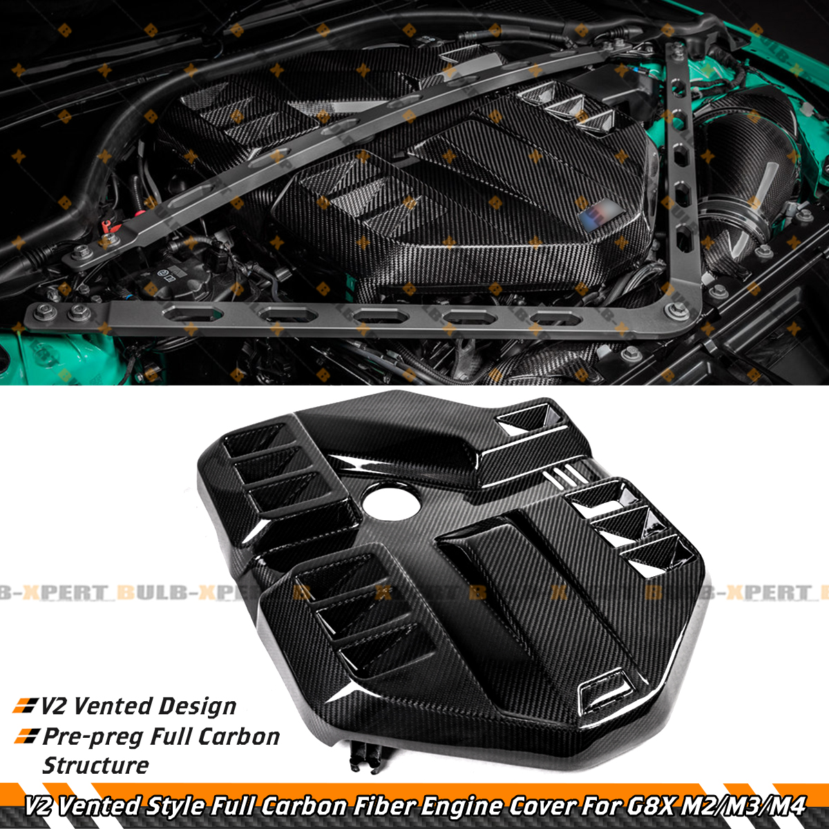- Real Prepreg Dry Carbon Fiber V2 Europe Vented Design Replacement Engine Cover For BMW G8X M2, M3 and M4. Unlike the Other Regular Engine Covers Which Leave the Engine Looking Incomplete , This Engine Cover is Designed to Extend Across the Charge Cooler and Providing You The Superb Heat Extraction With the Extra Vents.
