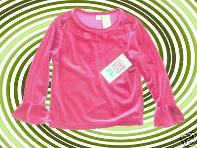 This top is long sleeve with a soft velvety feel. Around the neckline there are heart embroidered inbetween red velvety bows. The sleeves are belled at the bottom. The top is 90% polyester and 10% spandex.