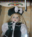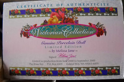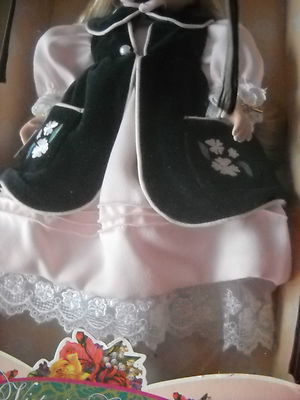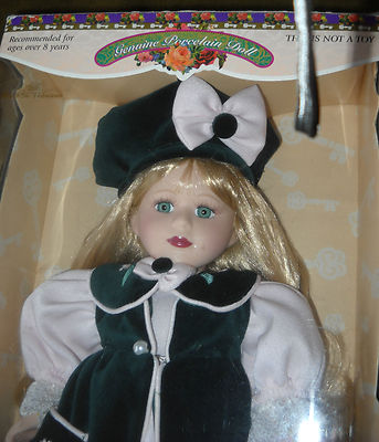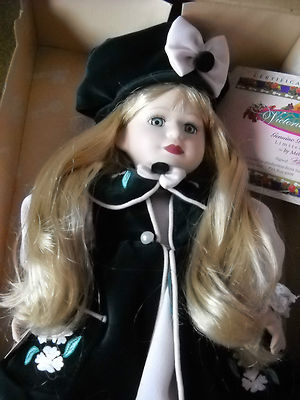 BEAUTIFUL PORCELAIN DOLL BY MELISSA JANE- 'LITTLE MONET IN VELVETEEN" PRETTY IN PINK WITH GREEN VELVET THIS IS A LIMITED EDITION DOLL - HIGHLY COLLECTIIBLE COMES WITH CERTIFICATE OF AUTHENTICITY HER ORIGINAL BOX HEIGHT; 18 INCHES GENUINE PORCELAIN DOLL