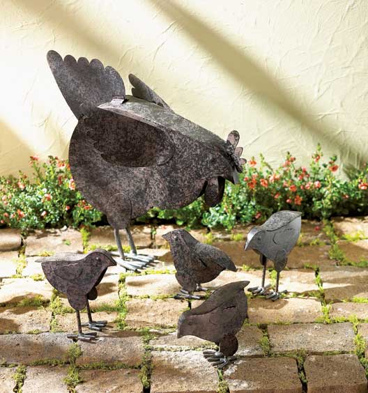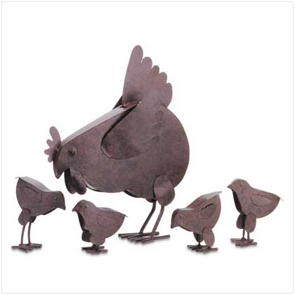Mother Hen and her young charges scratch up some lunch in this charming country garden sculpture. Rustic-finished metal. Hen 11 1/4" x 3 3/4" x 14 1/2" high.