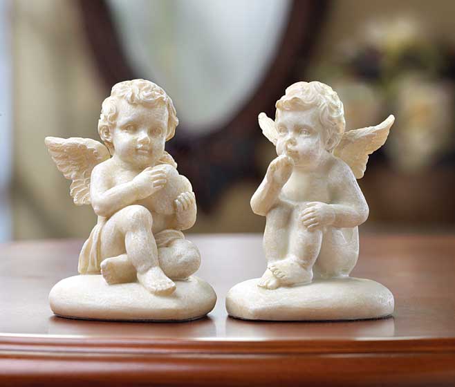 A twosome of tiny angels keeps careful watch, casting their loving gaze upon each moment of your everyday life. Cast in antiqued marble-look polystone, this petite pair bestows blessings wherever you choose to place them with pride! Polystone. Each is 2" diameter x 3" high.