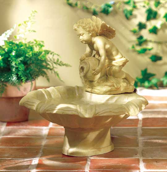 A charismatic cherub pours water into a graceful basin. Soothing water sound creates serenity in any room or garden. Pump included. UL recognized. Polyresin. 11 1/2" x 11" x 12" high.