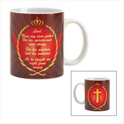 Honor the strength and kindness of your fathers gentle spirit with an inspiring prayer created just for him! Beautiful 11 oz. mug is an inspiring way to start the day; vivid screened wraparound graphics feature the Holy Cross on one side, a heartfelt prayer verse on the other. Stoneware. Microwave and dishwasher safe. 3?" diameter x 3¾" high. P65