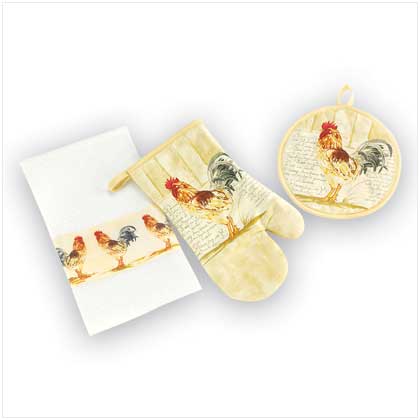 Farm-fresh accessories add country color to your home with a jaunty rooster print. This threesome of household helpers make cheerful companions for any kitchen chore! Set includes oven mitt, pot holder and dish towel. Cotton. Machine wash warm; tumble dry warm; do not bleach. Dish towel: 15" x 25" long; pot holder: 8" round; oven mitt: 6" x 12" long. Set of 3