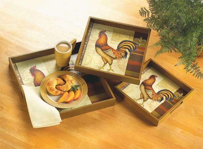 Whether your decor is elegant Country French or down-home country cozy, this trio of trays adds the perfect finishing touch! Three handy sizes handle any serving task with ease. Wood. Small: 10" square x 1½" high; medium: 12" square x 1½" high; large: 15" square x 2" high. Set