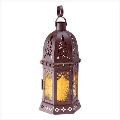 Candlelight takes on a dramatic air as it shines through golden pressed-glass panels and lacy cutout metalwork. A stunningly illuminating decoration! Metal ring on top for hanging; can also be used as standing lantern. Metal and glass. Candle not included. 4?" diameter x 10½" high.