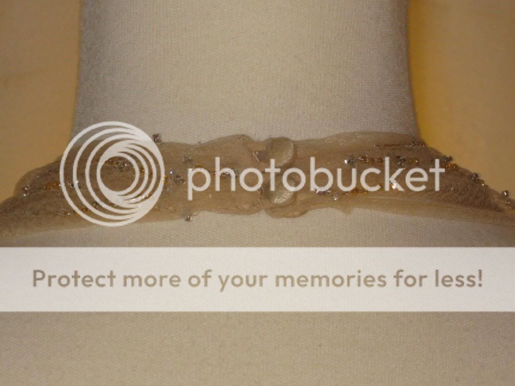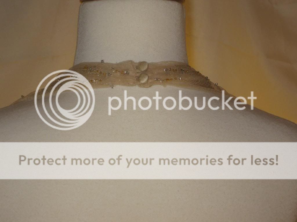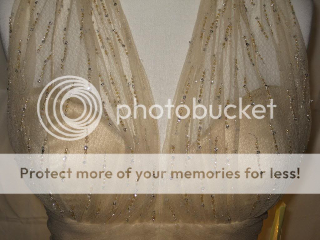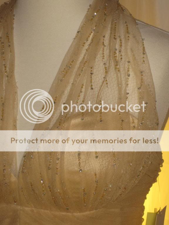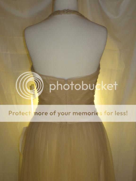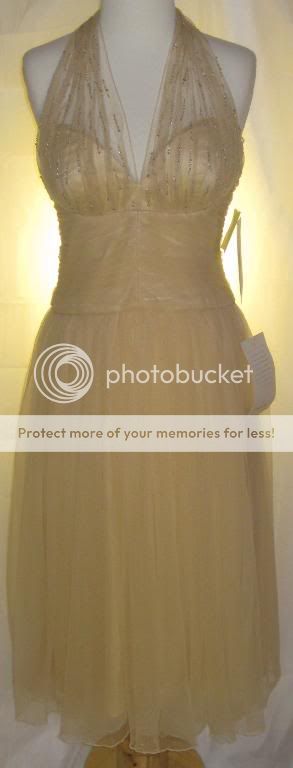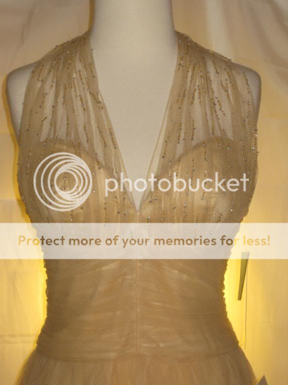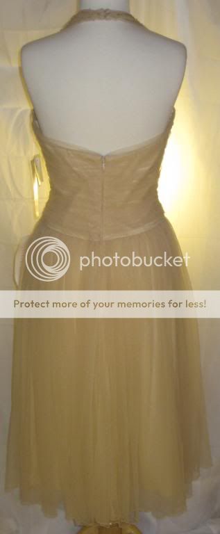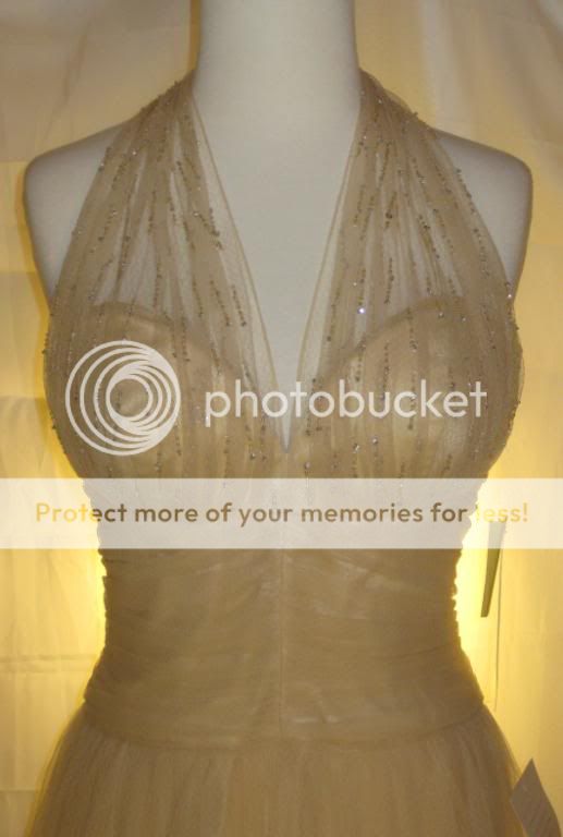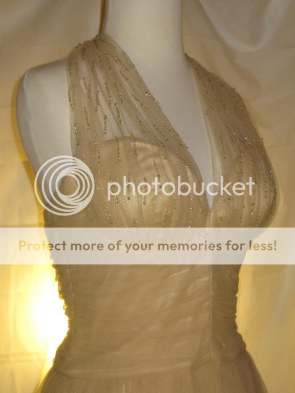This is an absolutely gorgeous dress by Badgley Mischka. Chiffon net fabric overlays satin. Gorgeous clear & champagne beading at neckline & bust adds just a bit of shimmer. Halter neckline with two covered buttons at nape of neck. Open, sexy back. Beautifully shirred bodice. Light boning in bodice with full skirt create a fab shape. This dress is the ultimate in classic femininity. Sways beautifully as you move. Ethereal, flattering, and just simply lovely.
