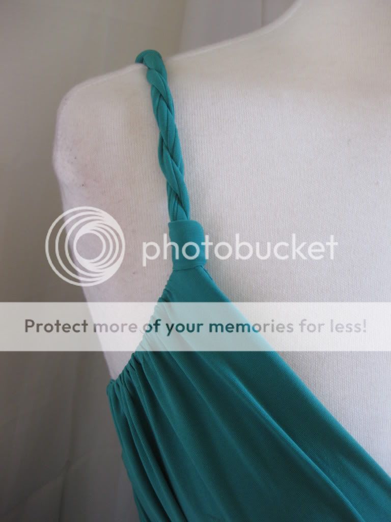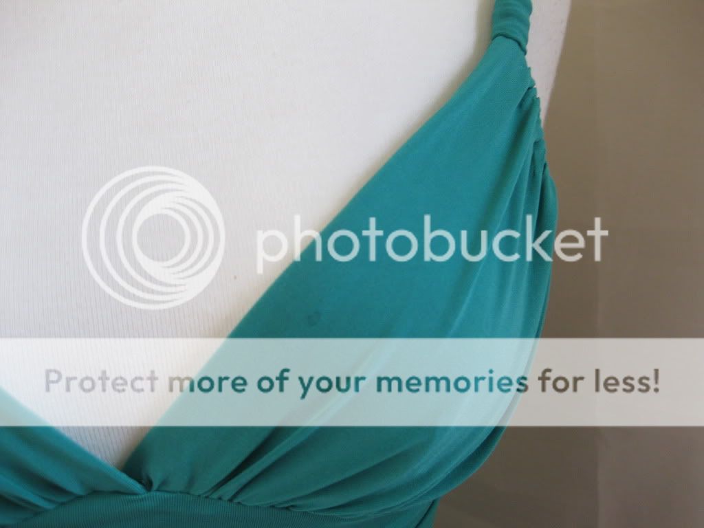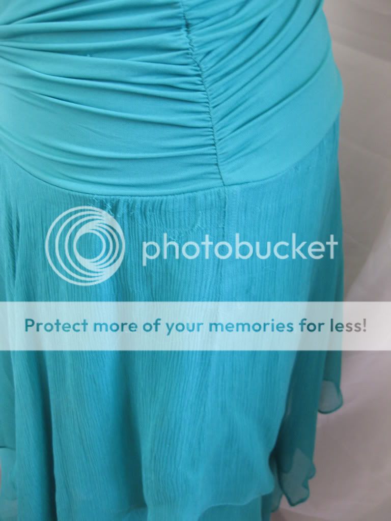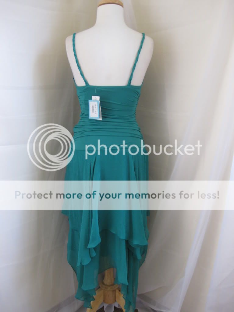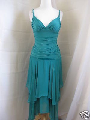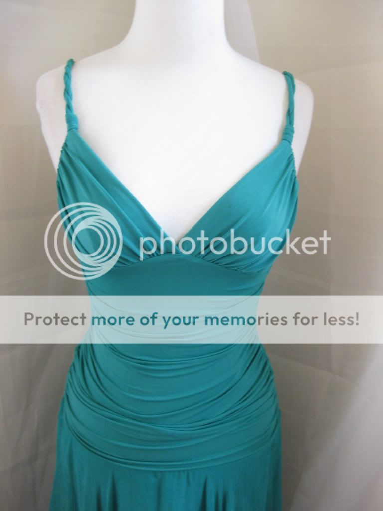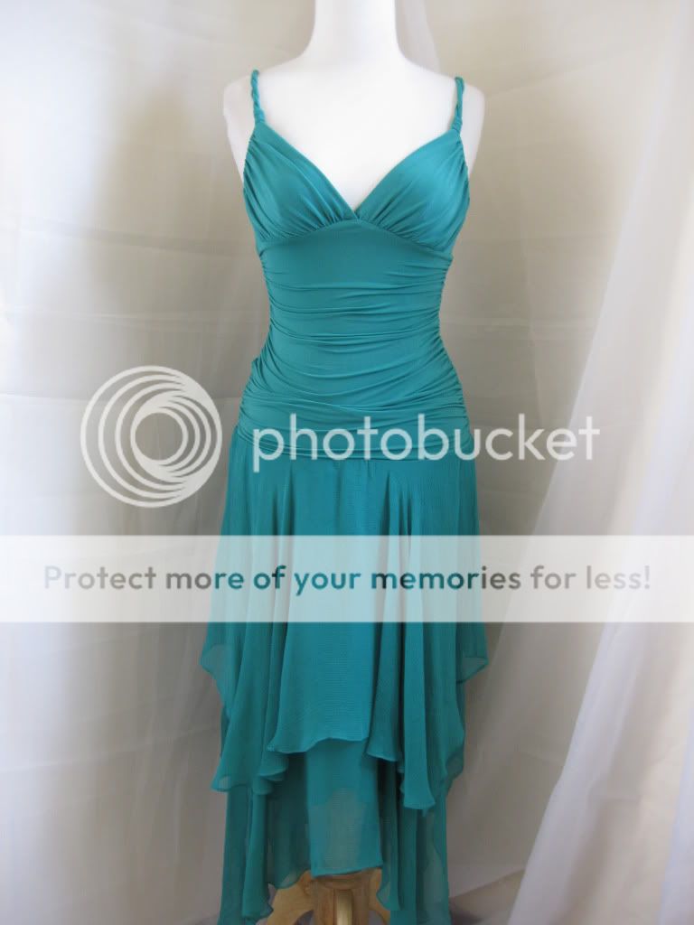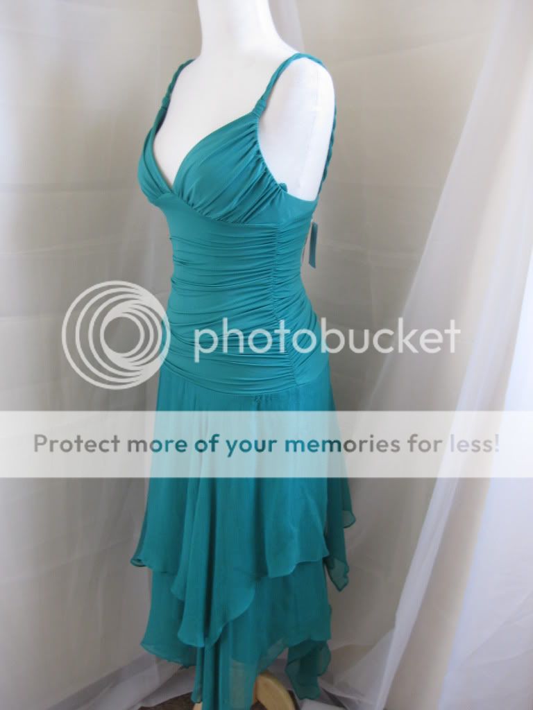 This is an absolutely stunning dress by BCBG Max Azria. It's such a beautiful and striking Jade green color. V-Neckline with twisted straps. Sides are ruched. skirt has 3 asymmetrical layers, the top two are sheer. Flows elegantly and is very sexy. **A couple tiny spots on top that may or may not come out with cleaning. Some fraying at the skirt due to nature of the fabric. See pics below. Not noticable unless standing up close. Still a very striking dress and worth every penny. Make it yours!