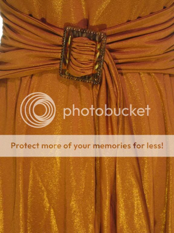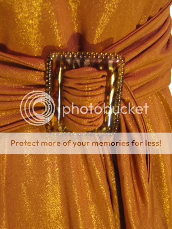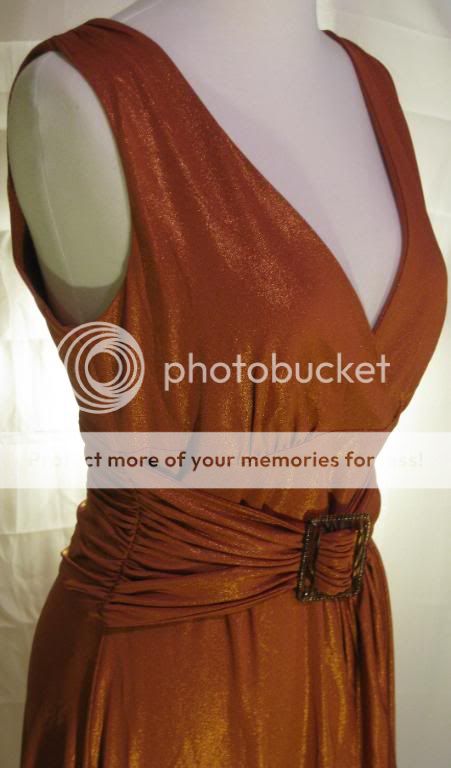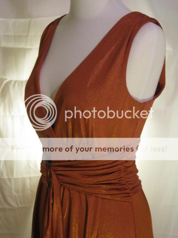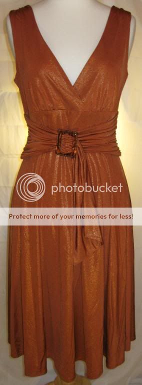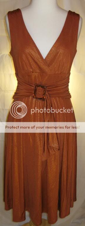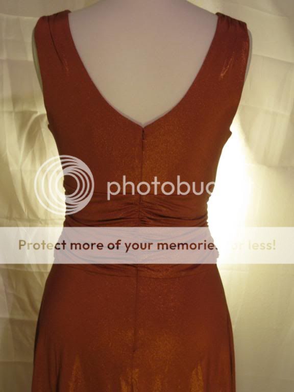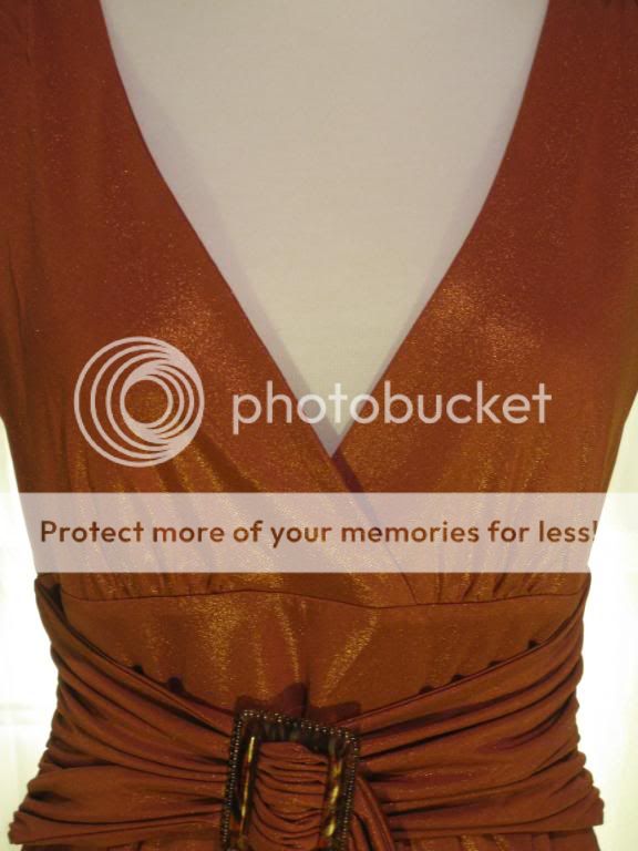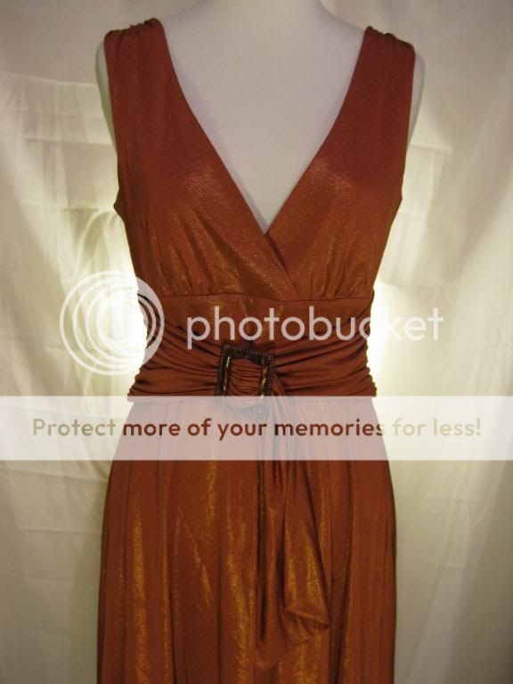 This is an absolutely gorgeous Max & Cleo dress. Look stunning and fabulous, and grab the room's attention in this sexy and shimmery deep v-neck dress. It falls just around the mid-calf and the skirt is very flowy. The dress is belted on the front side. Great for any special occasion!