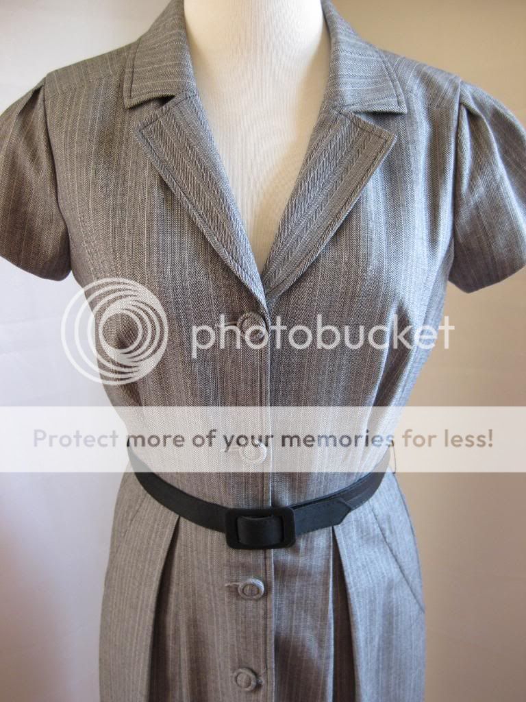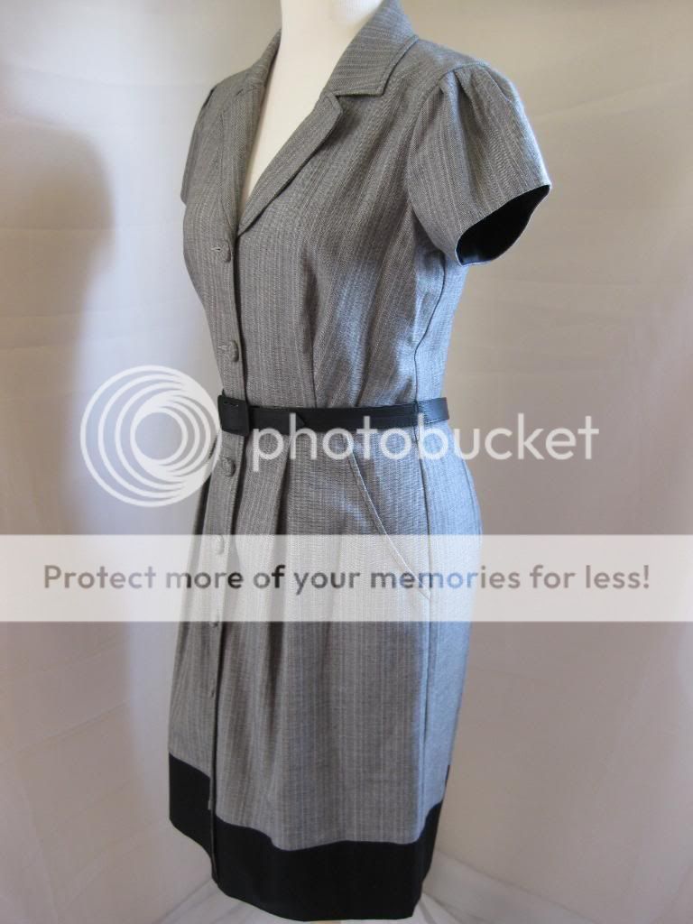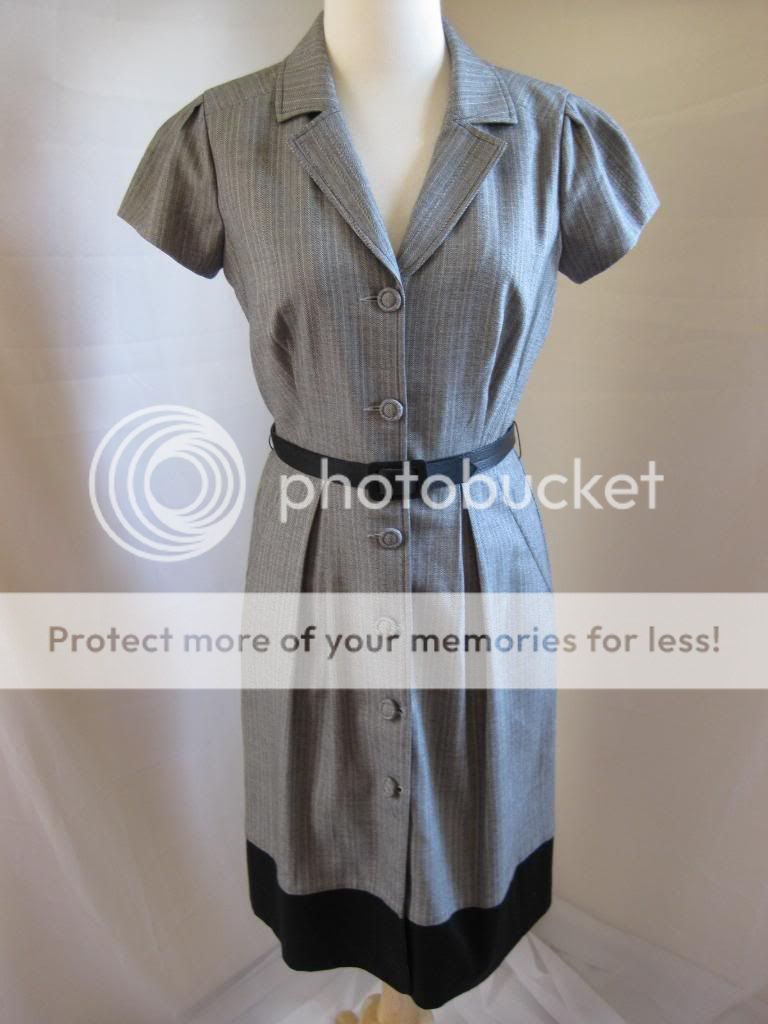 This is a beautiful dress for the workplace by BCBG Max And Cleo. Collared neckline. Black belt included. Two side pockets. Button opening all the way down the dress. Dress ends around below the knees. Look stylish at your work with this wonderful dress. Bid now at this low price before someone else takes this dress at a steal!