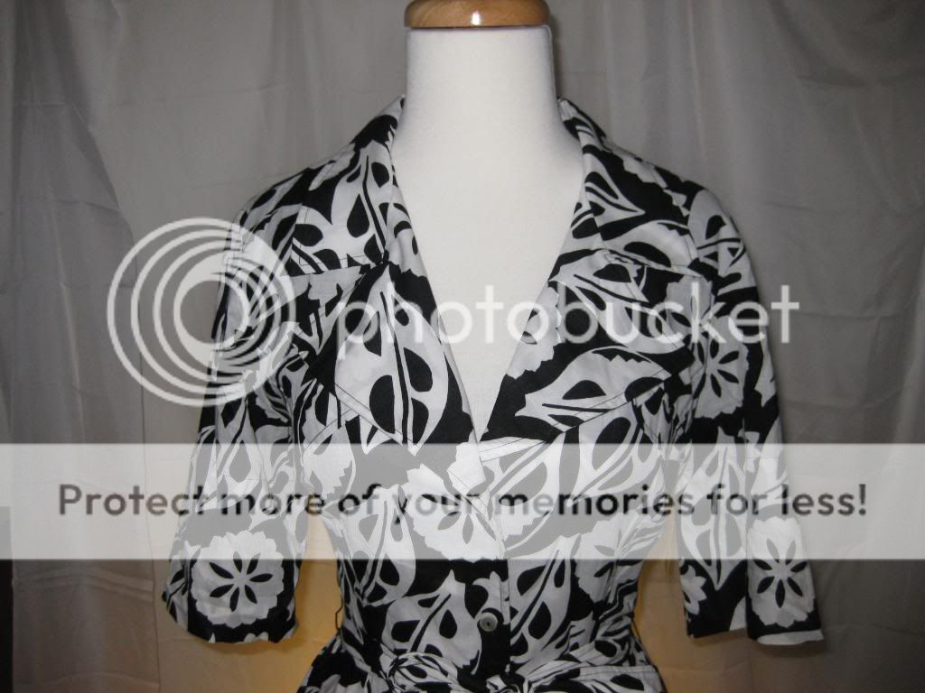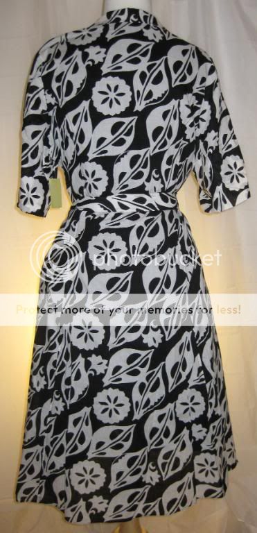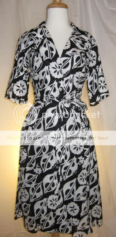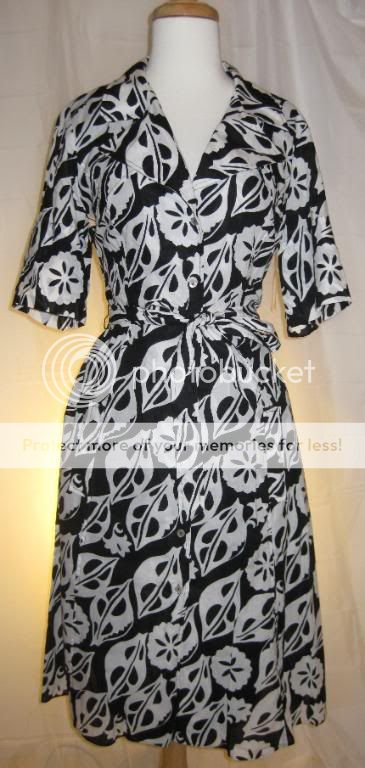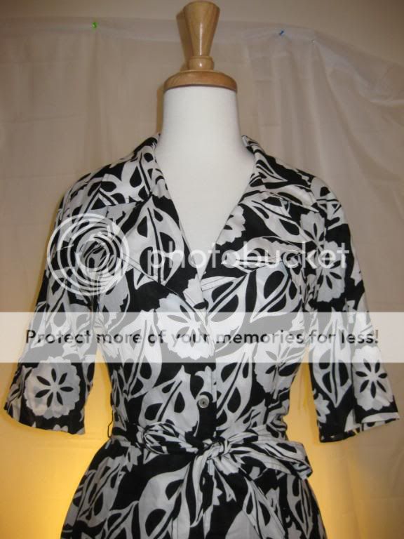 This stylish Shelli Segal dress is perfect for everyday wear or wear to work. It buttons all the way down and has a belt that ties at the waist. The sleeves seem to fall at or around the elbows. Look your best at work in this uniquely stylish dress. Includes extra button.