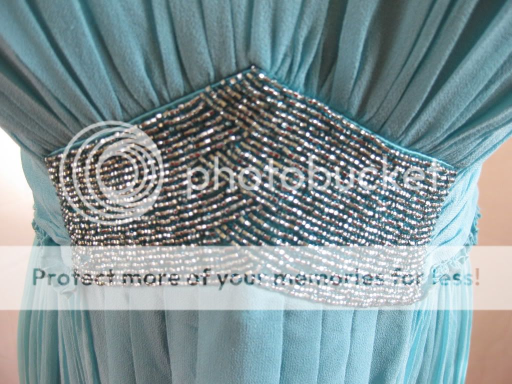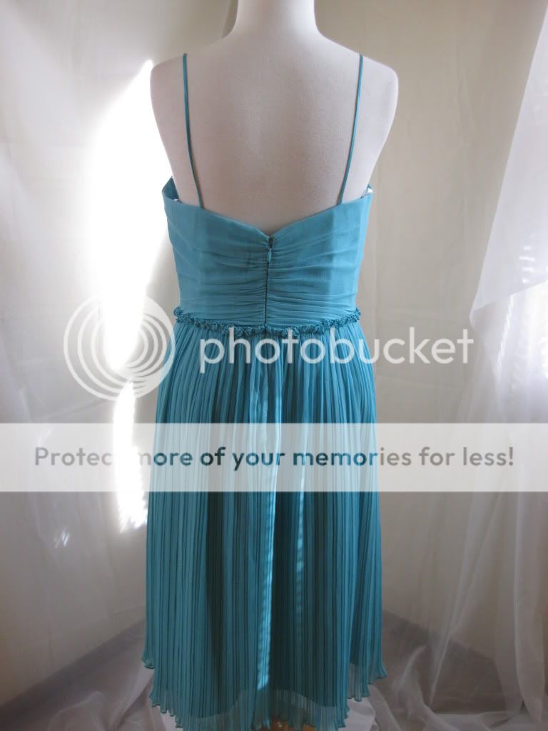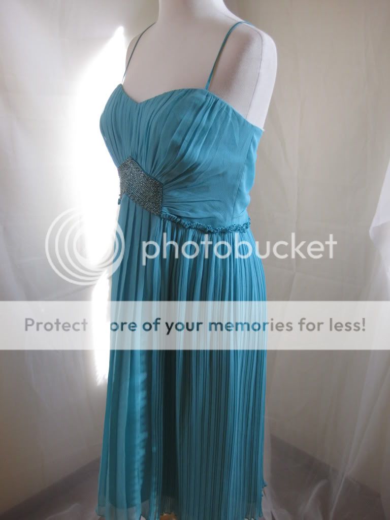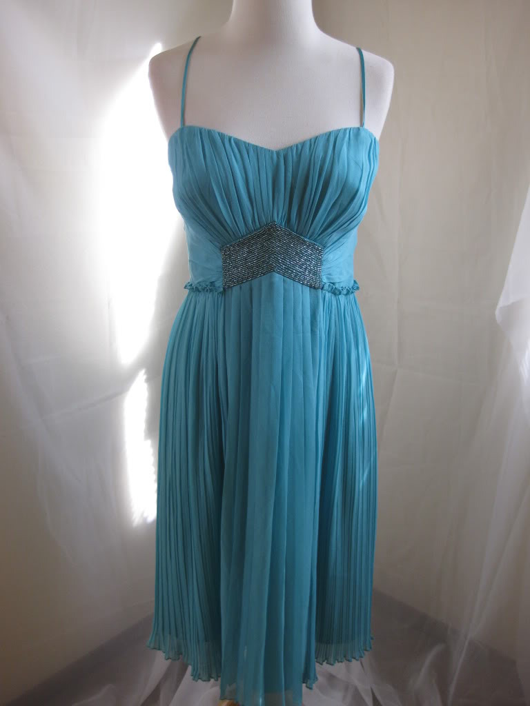 This is a beautiful and refreshing dress from Laundry by Shelli Segal. Spaghetti straps. Pleated skirt and slightly on the top. Beaded details in the front. Center zipper and hook and eye closure at the back. Very beautiful! Perfect for any special occasion or an elegant affair. Make it yours and buy it now before someone else does!