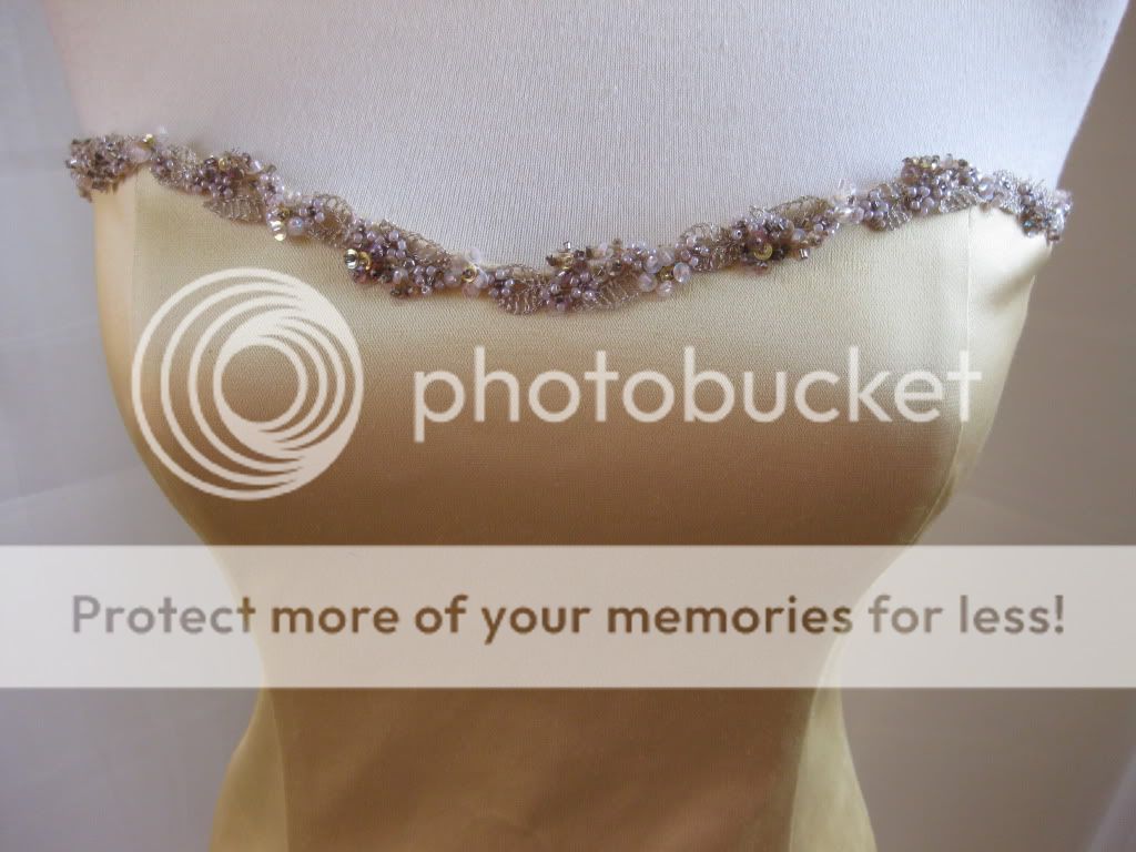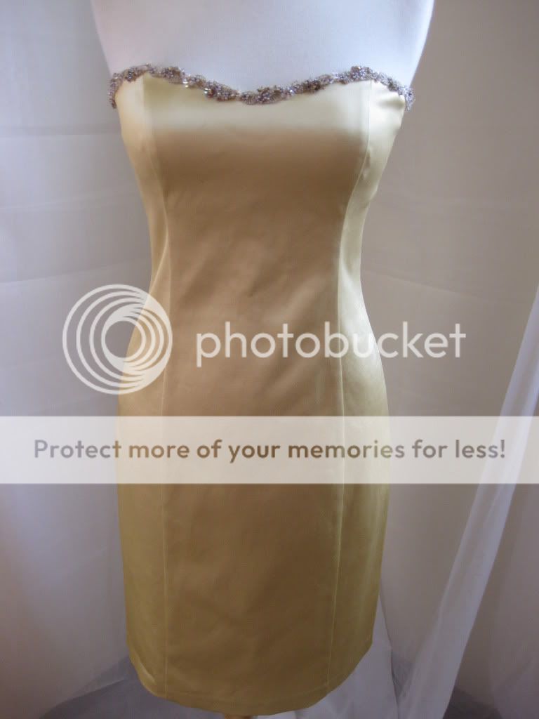 This is a beautiful and elegant dress by Maria Bianca Nero. The dress hits below the knees. Center zipper and hook and eye closure in the backside. Exquisite beaded details on the top lining of the front of the dress. Slit at the bottom center lining of the back. Very beautiful! Bid on this all new low price!