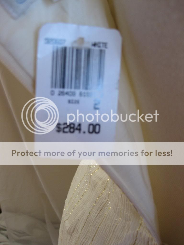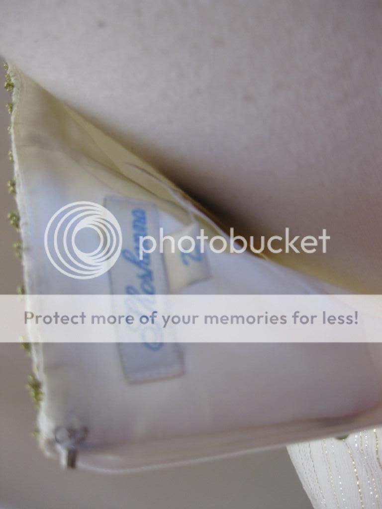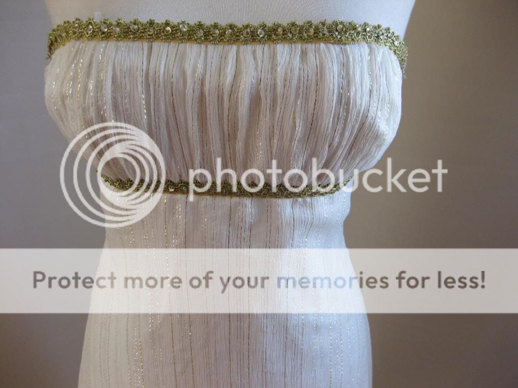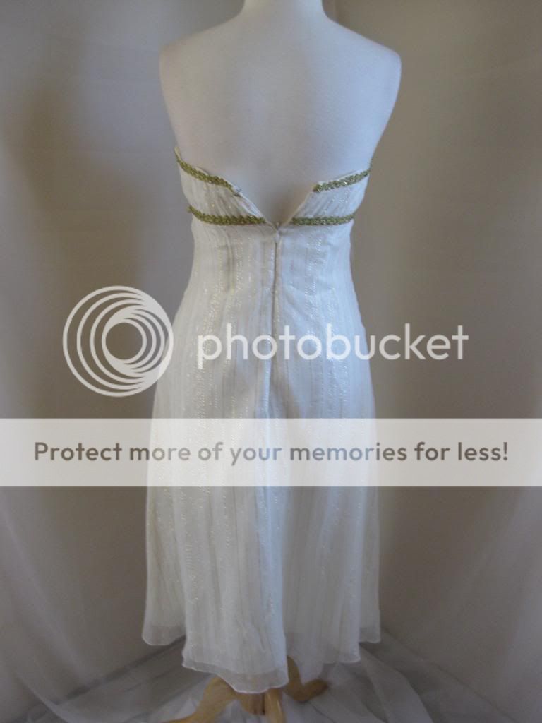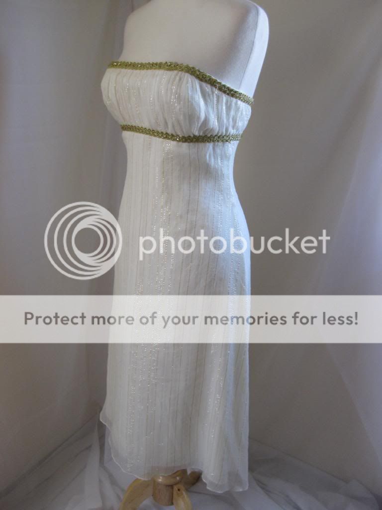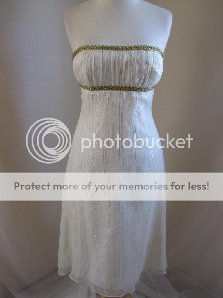 Absolutely pretty and feminine, this dress is created by Shoshanna. Strapless. Hidden back zipper and hook closure. Skirt hits below the knees. Has three layers, with the top layer being a sheer white with gold stripes all around. Gold lining around the top with some sequins. Very pretty and lightweight! Nice dress for any formal occasion, including prom or that special night out. Make this dress yours and buy it now :)