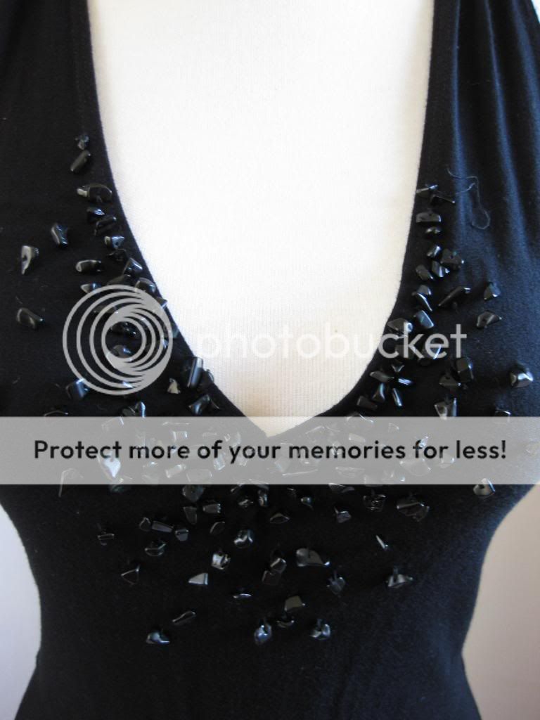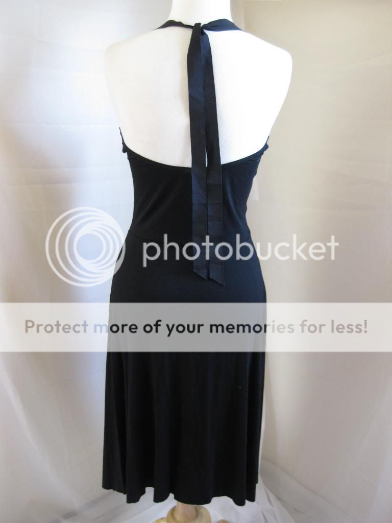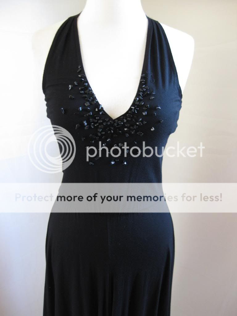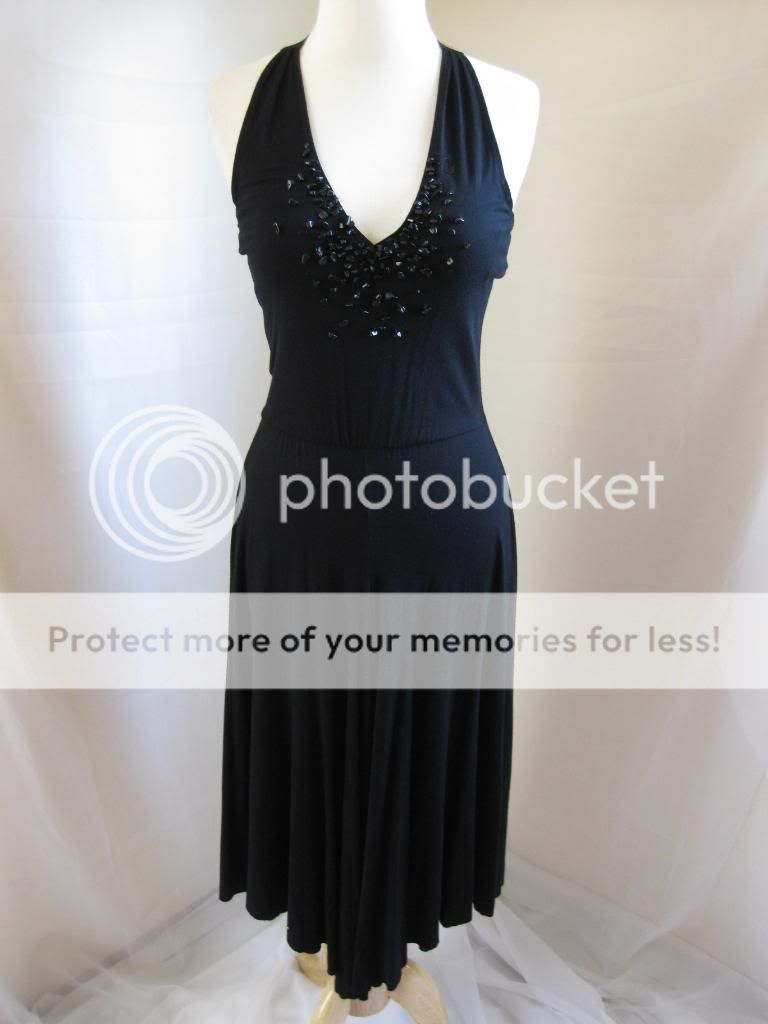 This is an incredibly sexy and sultry dress from Twelth Street by Cynthia Vincent. The dress ends around mid-calf. Halter neckline ties behind the neck. The top part of the dress is embellished in beautiful black beading. Very low v-neckline. Lightweight and gorgeous! Make this dress yours and bid now!