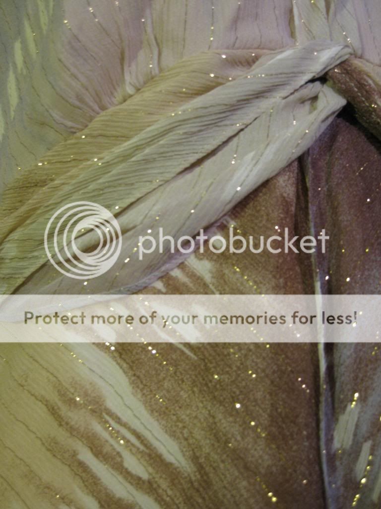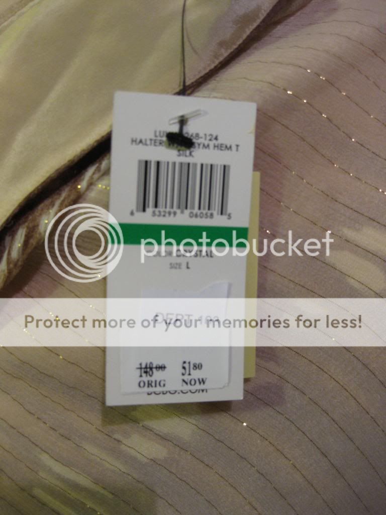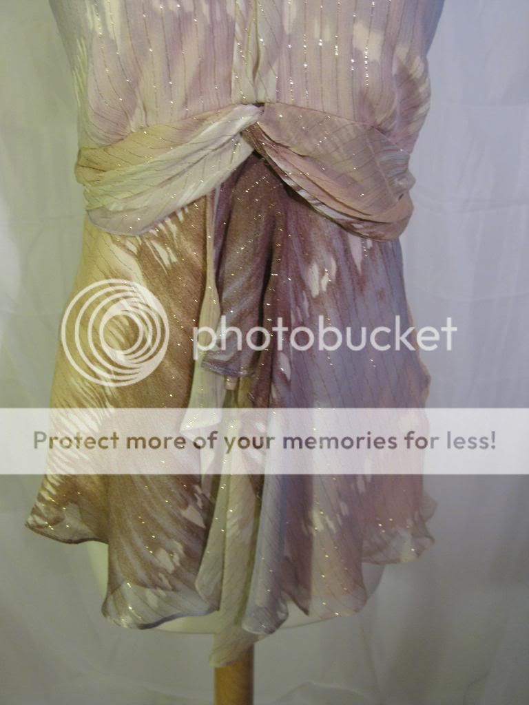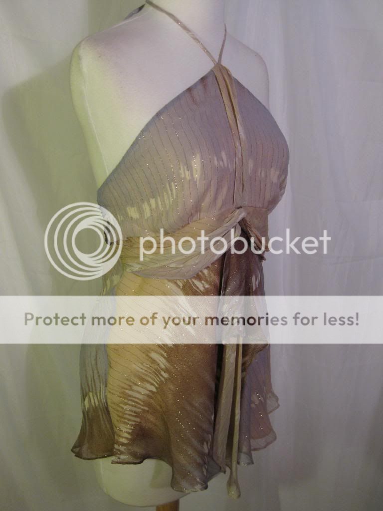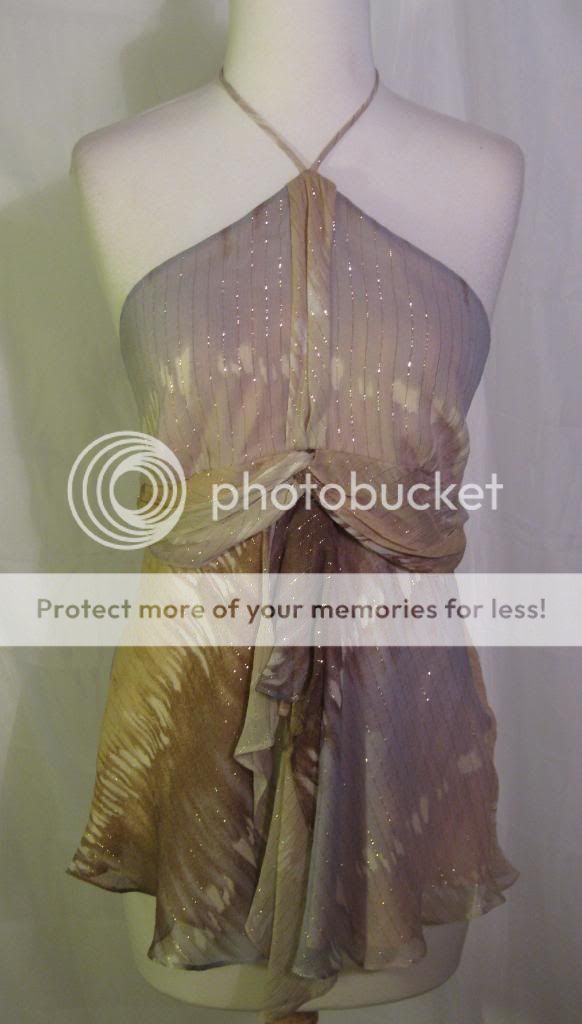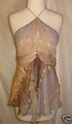 This is a very lovely silk halter top by BCBG Max Azria. The top is at mid-back and has glimmering gold lines throughout. The top layer is sheer and the inside layer is a light nude-like color. Very pretty! Enjoy!