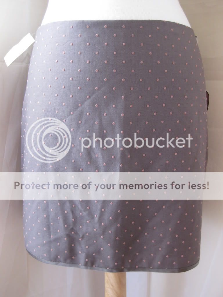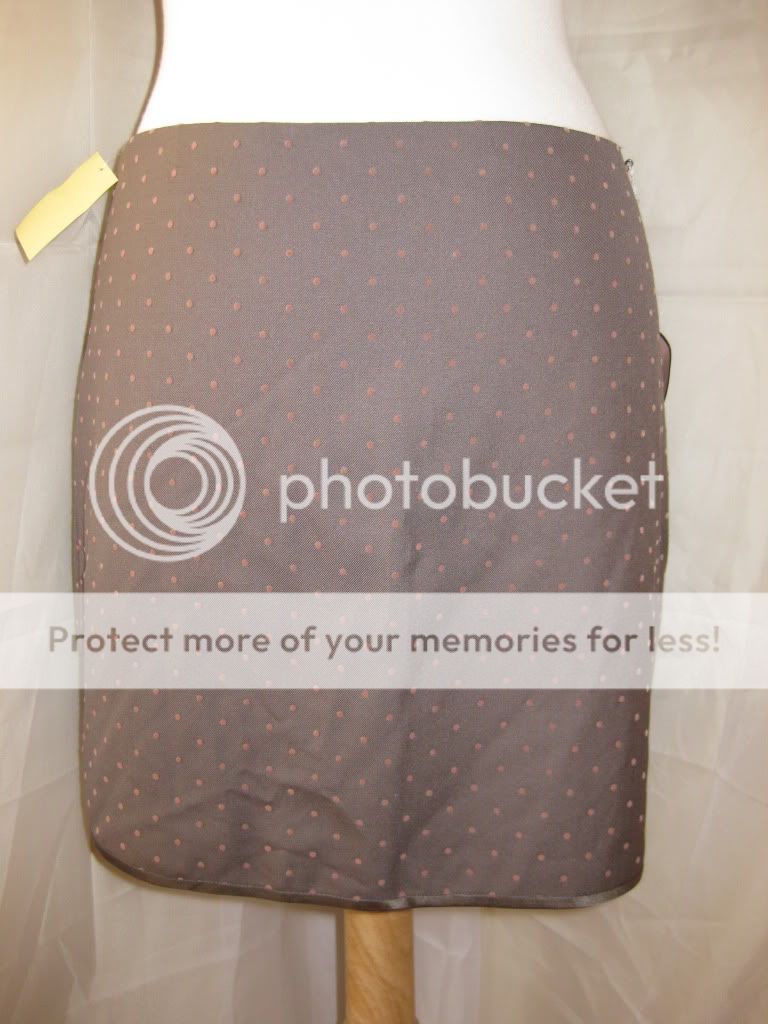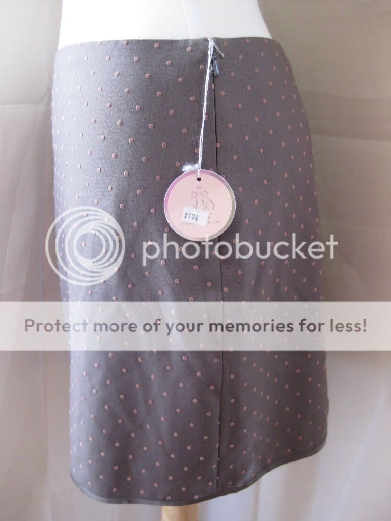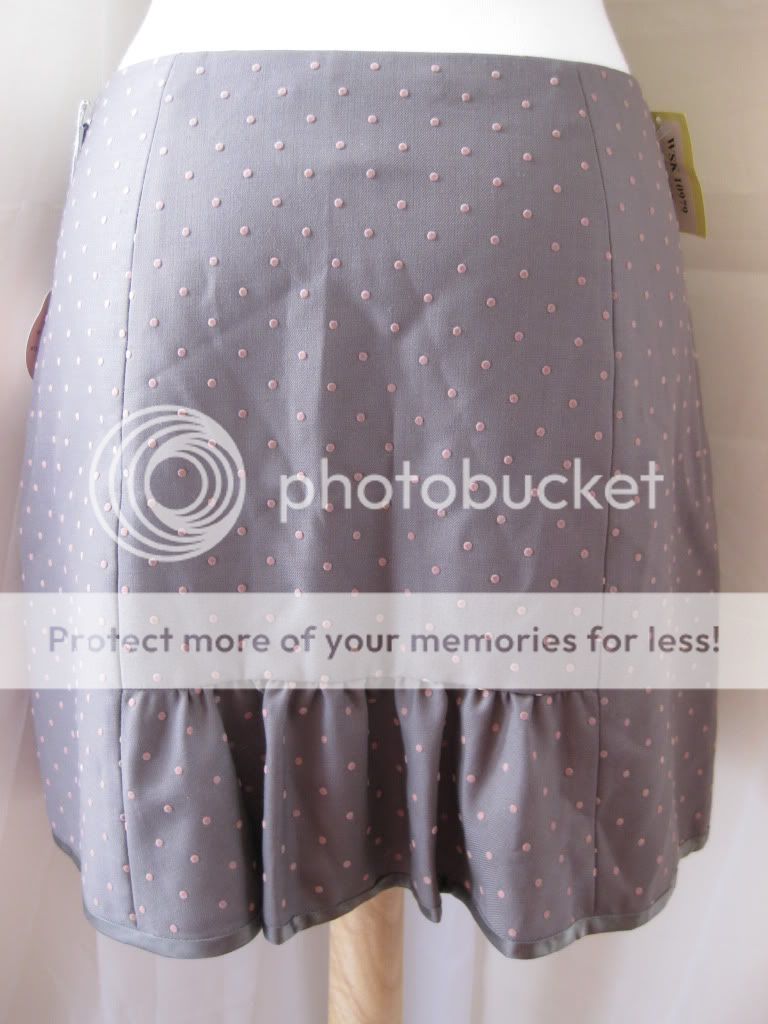 This is a feminine and flirty skirt by Rebecca Taylor. This is a short skirt that ends almost above the knees. Pale pink polkda dots throughout this grey skirt. Slight pleated at the center bottom of the backside. Hook & eye closure and zipper on the side. You'll definitely turn heads with this subtle but pretty skirt. Make it yours. Bid now before it's gone!