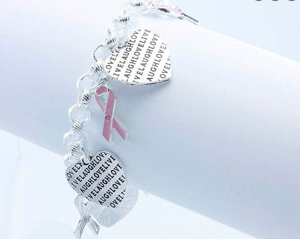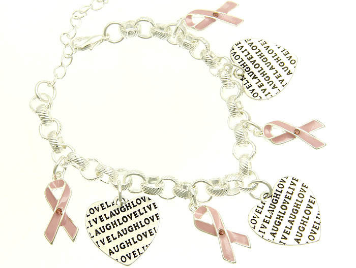 Silvertone with charms "Live, Love Laugh" and pink ribbons