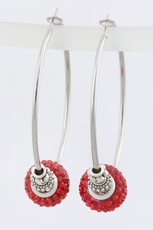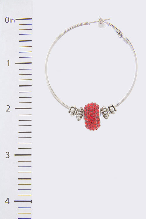 HOT Designer look Red Pave Crystal Stone Bead Charm Hoop Silvertone Earrings