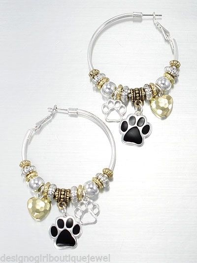 Paw Print Hoop Earrings Gold Silver Puppy Dog Cat Charm Heart Bead Dangle