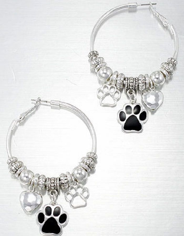 Paw Print Hoop Earrings Silver Puppy Dog Cat Charm Heart Bead Dangle USA Seller