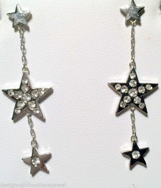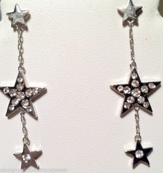 Silver Star Clear Crystal Dangle Earrings Lightweight 2" Classy