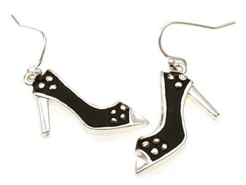 Stiletto high heel Shoe Charm Black Earrings Silvertone dangle Hypoallergenic