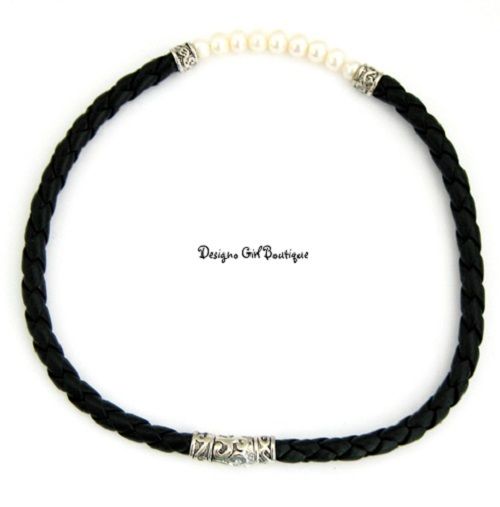 White Freshwater Pearl Silver Braided Black Leather Magnetic Necklace CHIC