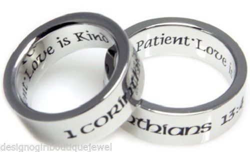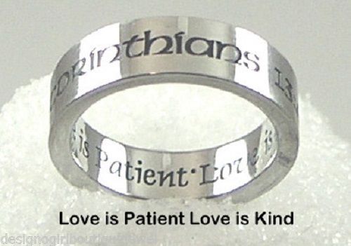 1 Corinthians 13:4 is beautifully engraved on the outside of the ring.