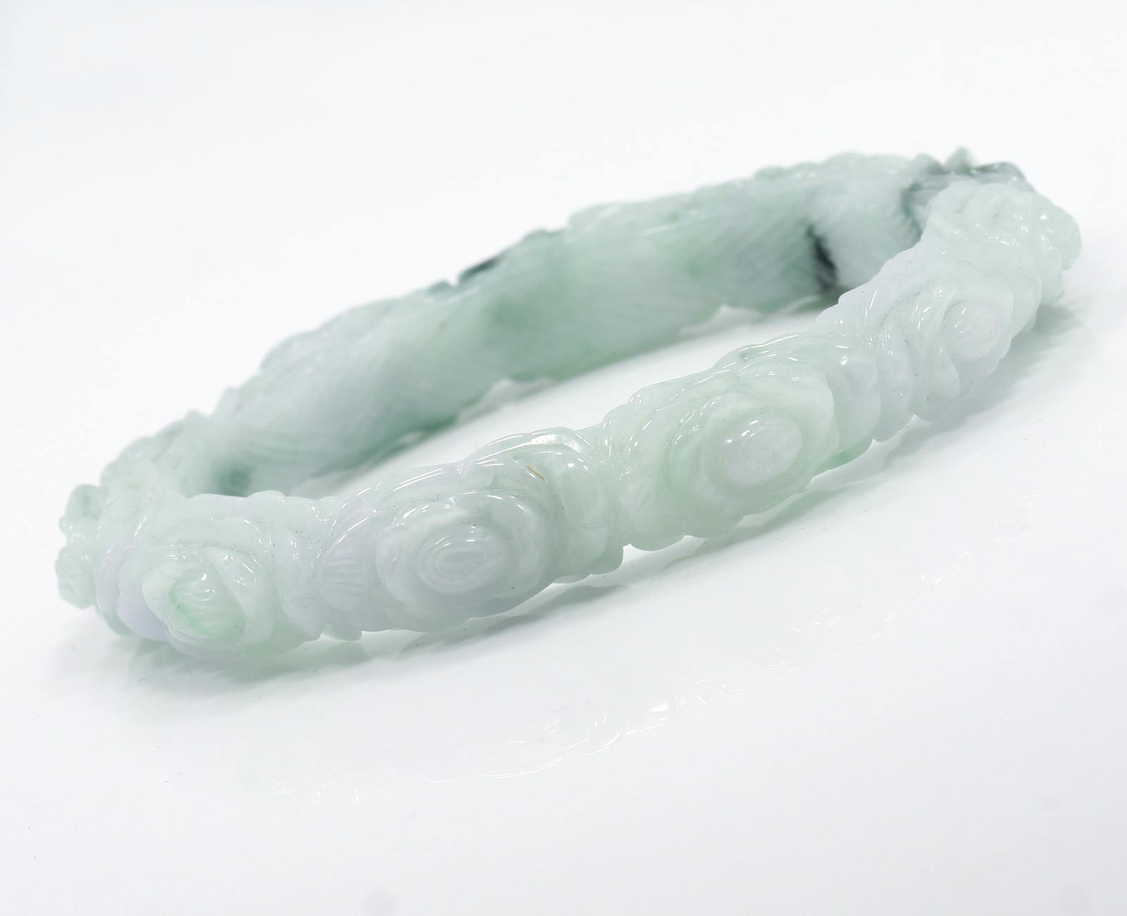 57mm Natural A Grade Untreated Burmese Jadeite Old Jade Roses Carved Bangle