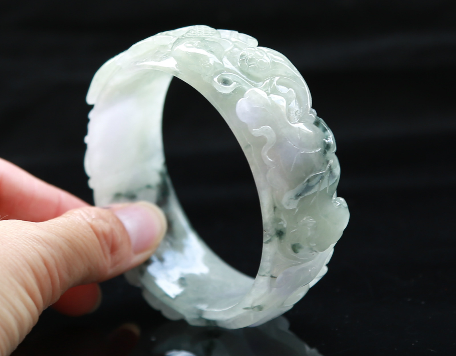 59.75mm 100% Natural A Grade Lavender Green Burmese Jadeite Icy Jade Sculpture Carve Wide Bangle