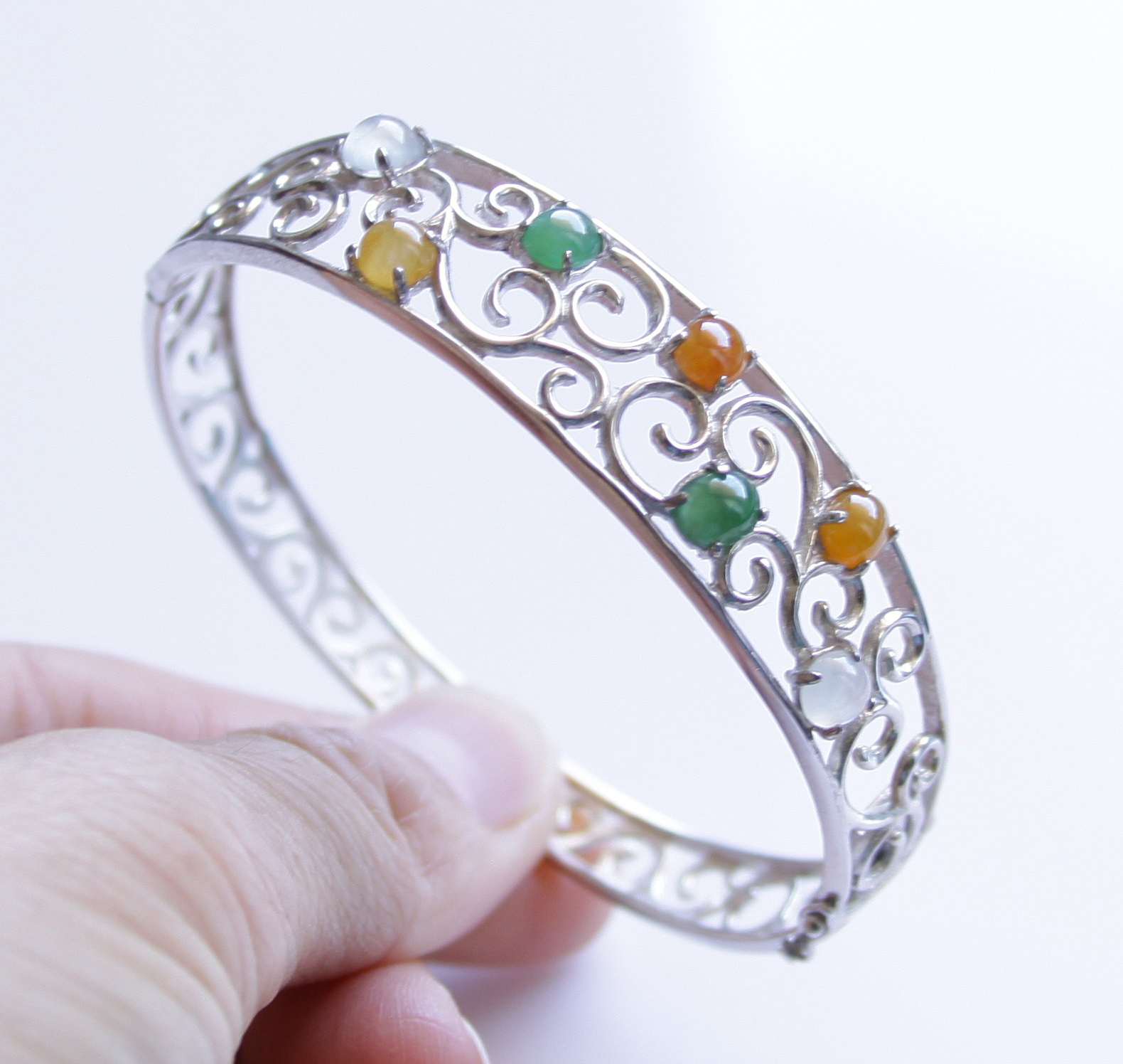Certified Untreated A Type Gem Grade Icy Burmese Jadeite Jade Sterling Silver Bracelet Bangle AJ9107