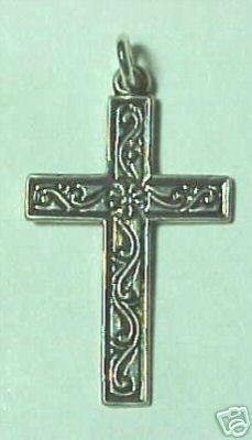 Lovely Sterling silver FLORAL DESIGN CROSS pendant with jump ring measures 1 1/4" high by 11/16" wide and weighs 1.71 grams. It has a criss cross textured back. One of our most popular crosses.