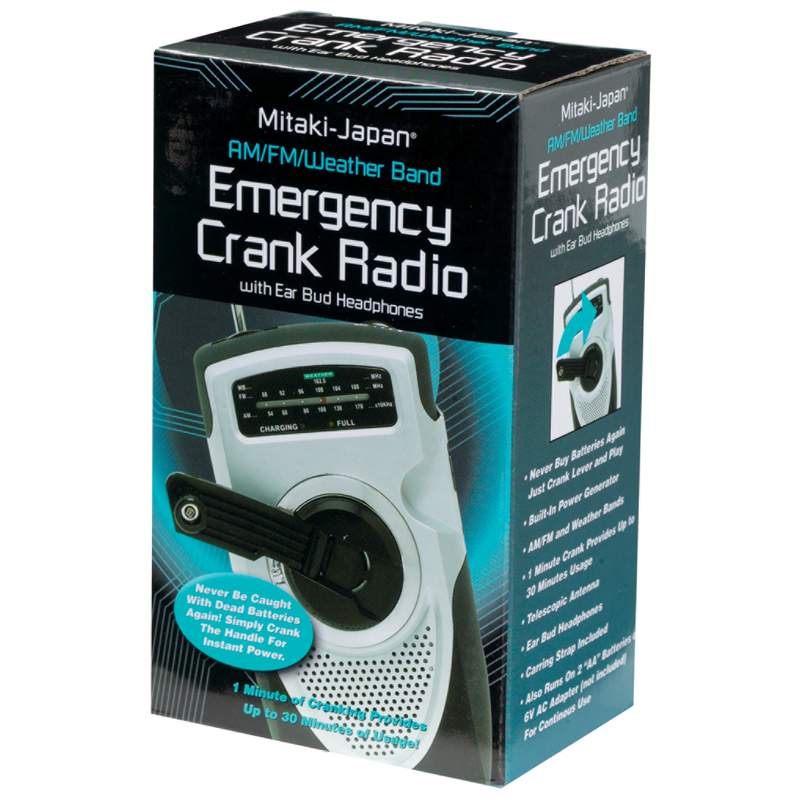 The perfect addition to an emergency kit. When the electricity goes off at home work or while traveling you can listen to the radio by simply cranking the handle for approximately 60 seconds. Comes with telescopic antenna 2" speaker and ear buds. Also runs on 2 AA batteries or 6V AC adapter (not included). Limited 90-day warranty. Gift boxed.