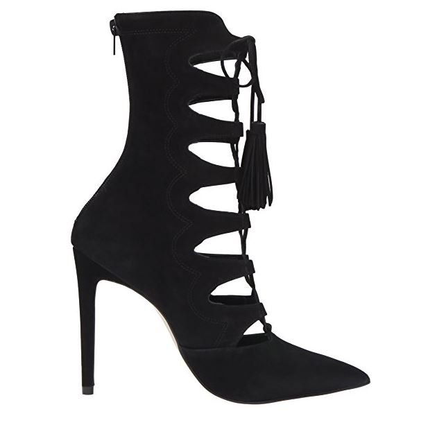 - Mid-calf boot featuring open lace-up front and tasseled ties
