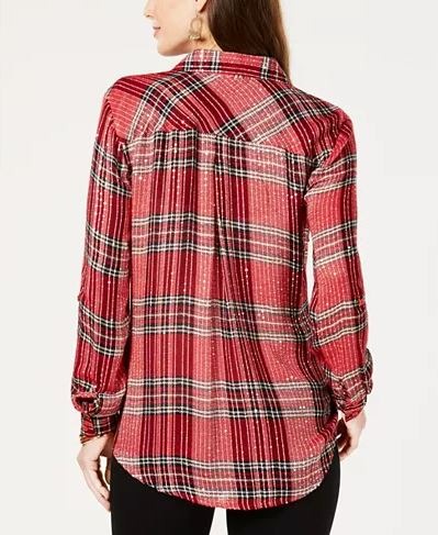 Sequins add endless dazzle to this petite shirt from Style & Co, designed in classic plaid with clever roll-tab sleeves. - Relaxed fit; hits at hip; approx. 27" long