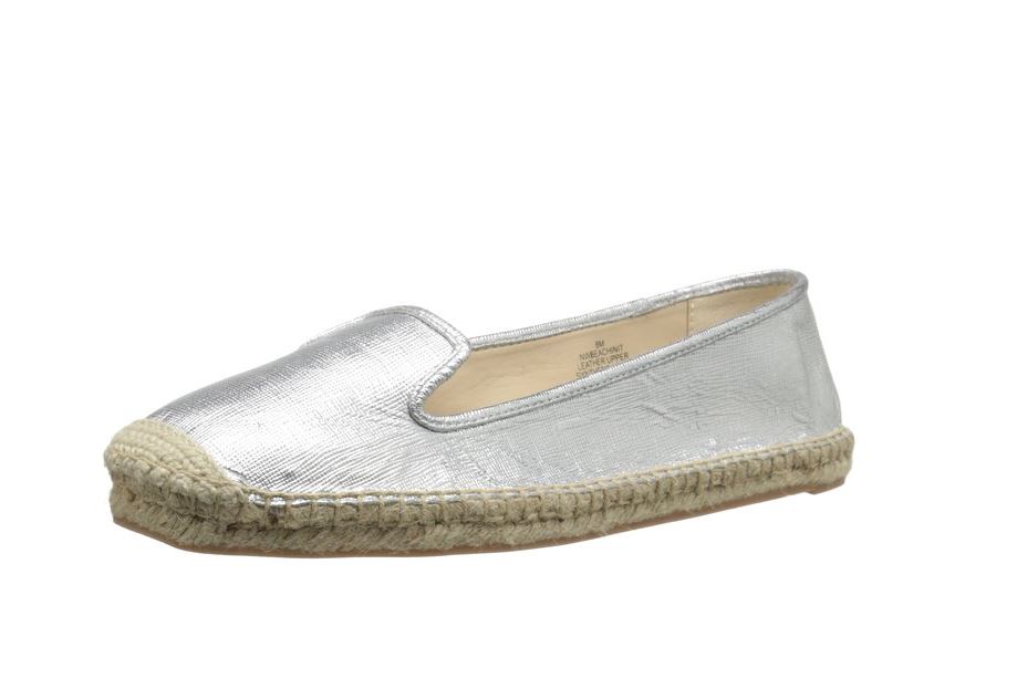 - Espadrille featuring jute-wrapped midsole and metallic upper with dual notches on vamp