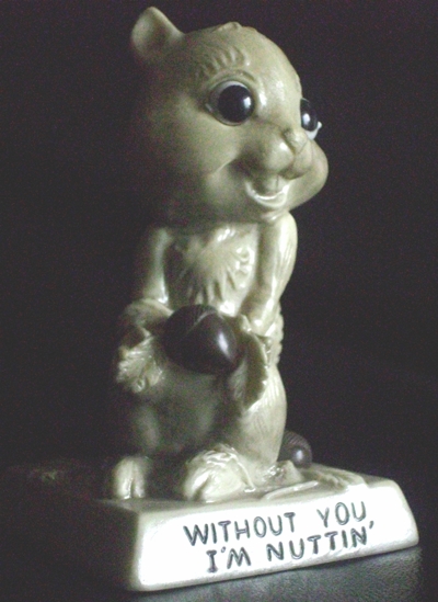 This is the collectible, "With out You I'm Nuttin" Squirrel by Russ Berrie and Company, INC. and Wallace Berrie and Co., INC. It has the dates 1968, 1969,1970. The squirrel is in mint condition. It measures 5"x3".