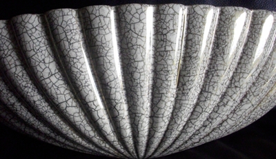 I am unsure the make of this planter but it is an elegant art nouveau vintage beauty. This is a large planter that measures 15 5/8" x 4 7/8". It is shaped like a half shell with a milk cream color paint and a busy veiny gold paint on top. As shown in the photos there is a little nip or chip in the corners that is unnoticeable and a small crack on the back of the planter. The crack can be sealed if you desire. But it is still in wonderful condition and would be a wonderful jewel in anyone's home.