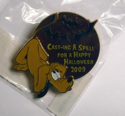 Pluto is the Pin on Pin, background is dark red with "Cast-ing A Spell for a Happy Halloween 2009" written in Yellow, 3 black bats flying above the words.