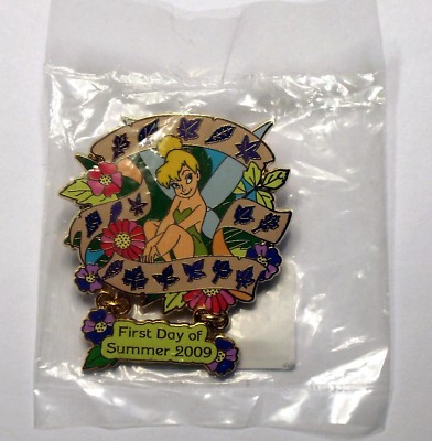 This pin is a dangle. The dangle has one purple flower at the top left and the bottom right. The dangle itself is light green, and reads First Day of Summer 2009.
