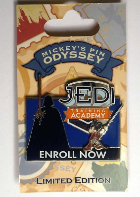 This limited edition pin features Jedi Mickey facing Darth Vader at the Jedi Training Academy. Mickey is pin-on-pin 3-D. The silhouette of Darth Vader holds a red light saber. The JEDI Training Academy shield above Mickey is shiny polished silver. A black bar across the bottom says "ENROLL NOW."