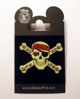 jewels on the crossbones and one red jewel in the right eye. The pin glows in