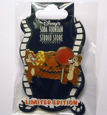 This pin features Chip and Dale standing in front of a scary jack 'o lantern, admiring their Halloween candy haul. Dale is carrying a huge stack of candy corn, while Chip proudly stands with his lollipop wrapped in red.