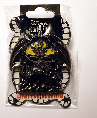 You are bidding on a Disney Soda Fountain Pin that was just released on 3/26/11. This pin features a portrait framed of Chernabog the demon of Bald Mountain from Walt Disney's “Fantasia” the frame is a silver sculptured frame. Chernabog's portrait background has yellow flames. The frame also features Chernabog's sculpted wings.