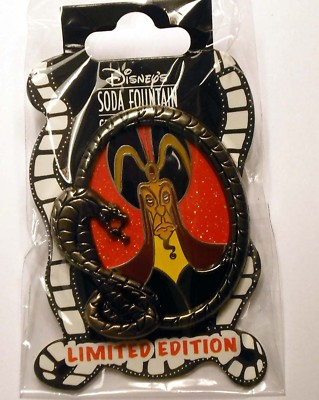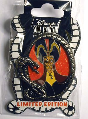 You are bidding on a Disney Soda Fountain Pin that was just released on 3/26/11. This pin features a portrait framed of Jafar from “Aladdin” the frame is a silver sculptured frame. Jafar's portrait background has a glittery orange color. The frame also has a sculptured of Jafar as a snake.